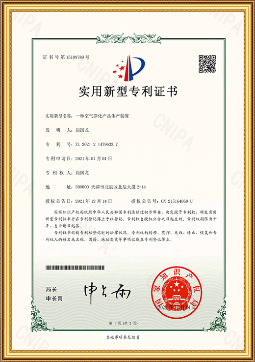 實(shí)用新型專利證書(shū)(一種空氣凈化產(chǎn)品生產(chǎn)裝置
